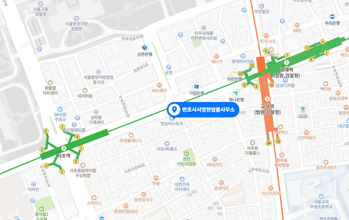 오시는 방법 고객을 최우선으로 하는 변호사 서영현 법률사무소는 교대역 9번출구에서 200m 직진하시면, 한승아스트라빌딩 13층에 위치하고 있습니다. (건물오른편에 주차장 있음)